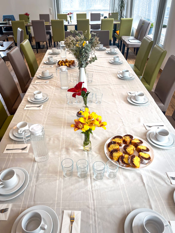 Neben der Möglichkeit in der eigenen Wohnung selbst zu kochen, nehmen unsere Mieter gern die Alternative des gemeinsamen Mittagstisches in Anspruch. Eine gemeinsame Mahlzeit im stilvollen Ambiente ist wie ein klein wenig täglicher Urlaub.